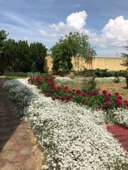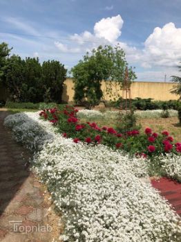 Большой ухоженный двор с плодовыми деревьями и цветами.