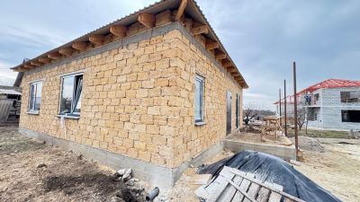 Дом утеплен, нанесена фактурная штукатурка короед, окрашен. Смонтирована водосточная система. По периметру дома широкие отмостки. Во дворе залита стяжка в зоне террасы и крыльца.