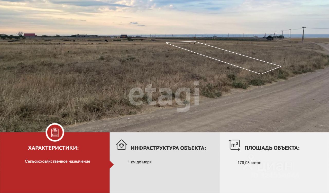 Продается видовой земельный участок у моря в селе Знаменское площадью 179,03 соток. Разрешенное использование-сельскохозяйственное использование.