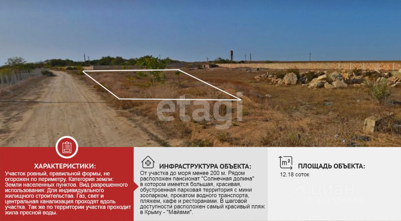 От участка до моря менее 200 м. Рядом расположен пансионат "Солнечная долина" в котором имеется большая, красивая, обустроенная парковая территория с мини зоопарком, прокатом водного транспорта, пляжем, кафе и ресторанами. В шаговой доступности расположен самый красивый пляж в Крыму - "Майами".
