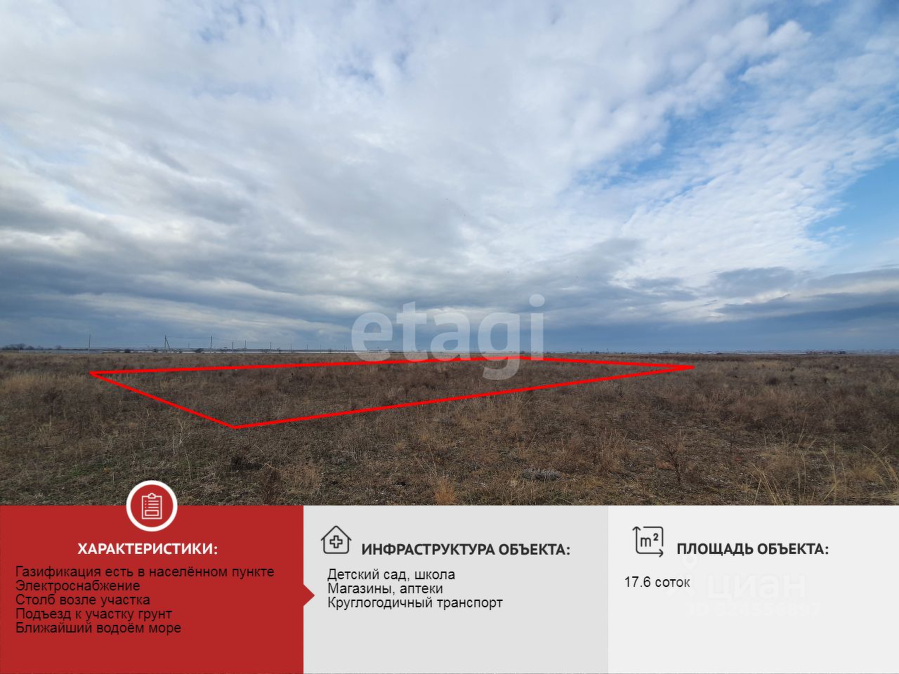 Расстояние до скалистого пляжа - 1 км, до песчаного пляжа - 1.5 км. Расстояние до города Евпатория - 72 км, до Черноморского - 15 км. Документы РФ. Один собственник.