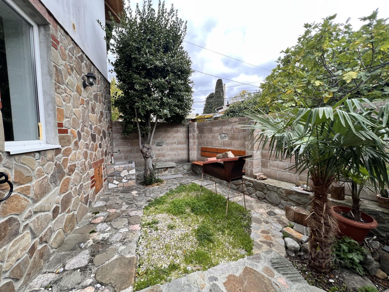 Участок 1.2 сотки, на участке итальянский дворик с местами для отдыха Пальмы мангал, парковка для авто.