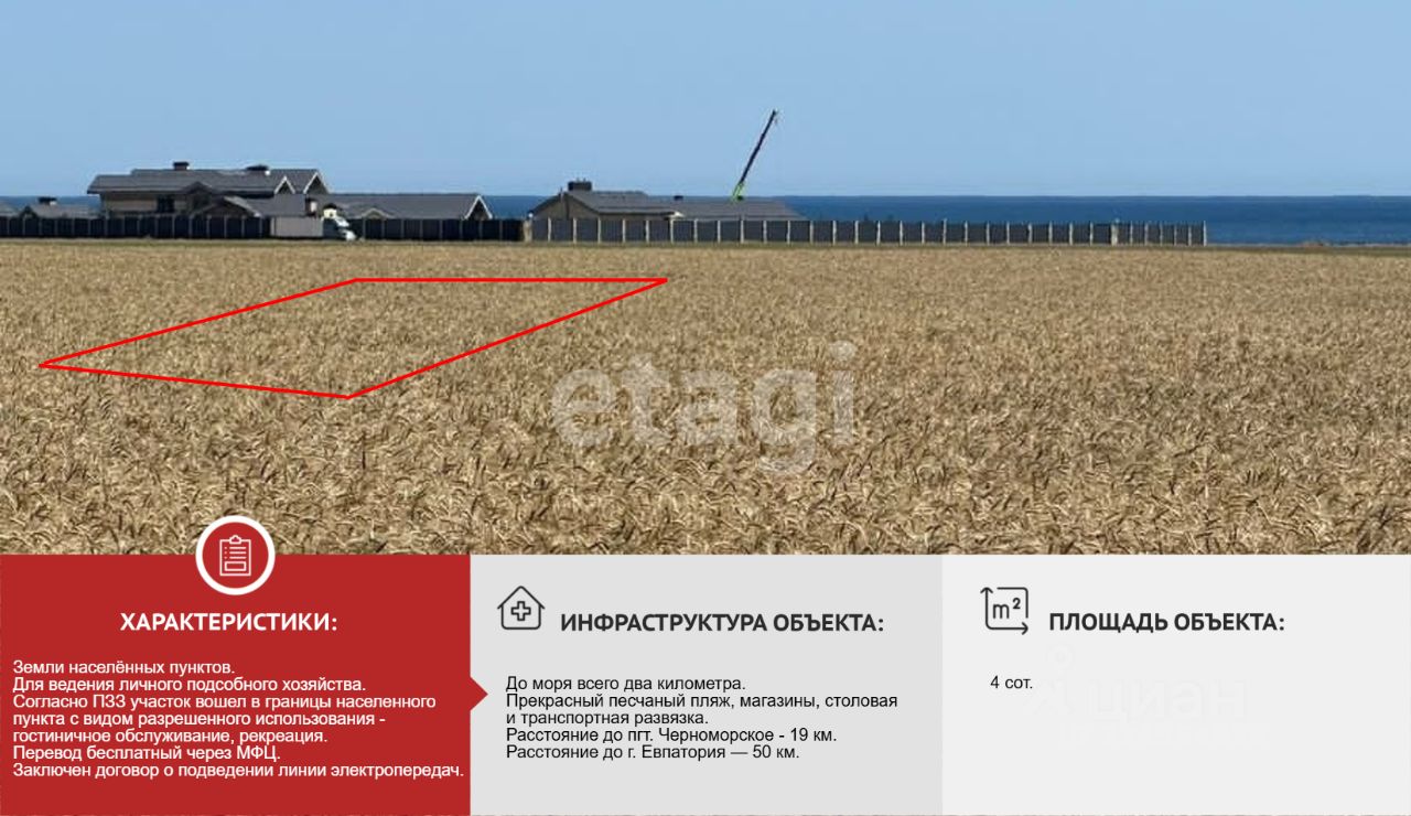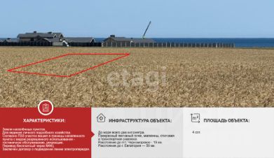 Продам перспективный видовой участок на берегу моря в поселке Знаменское площадью 4 сотки. Вид разрешенного использования- Для ведения личного подсобного хозяйства.