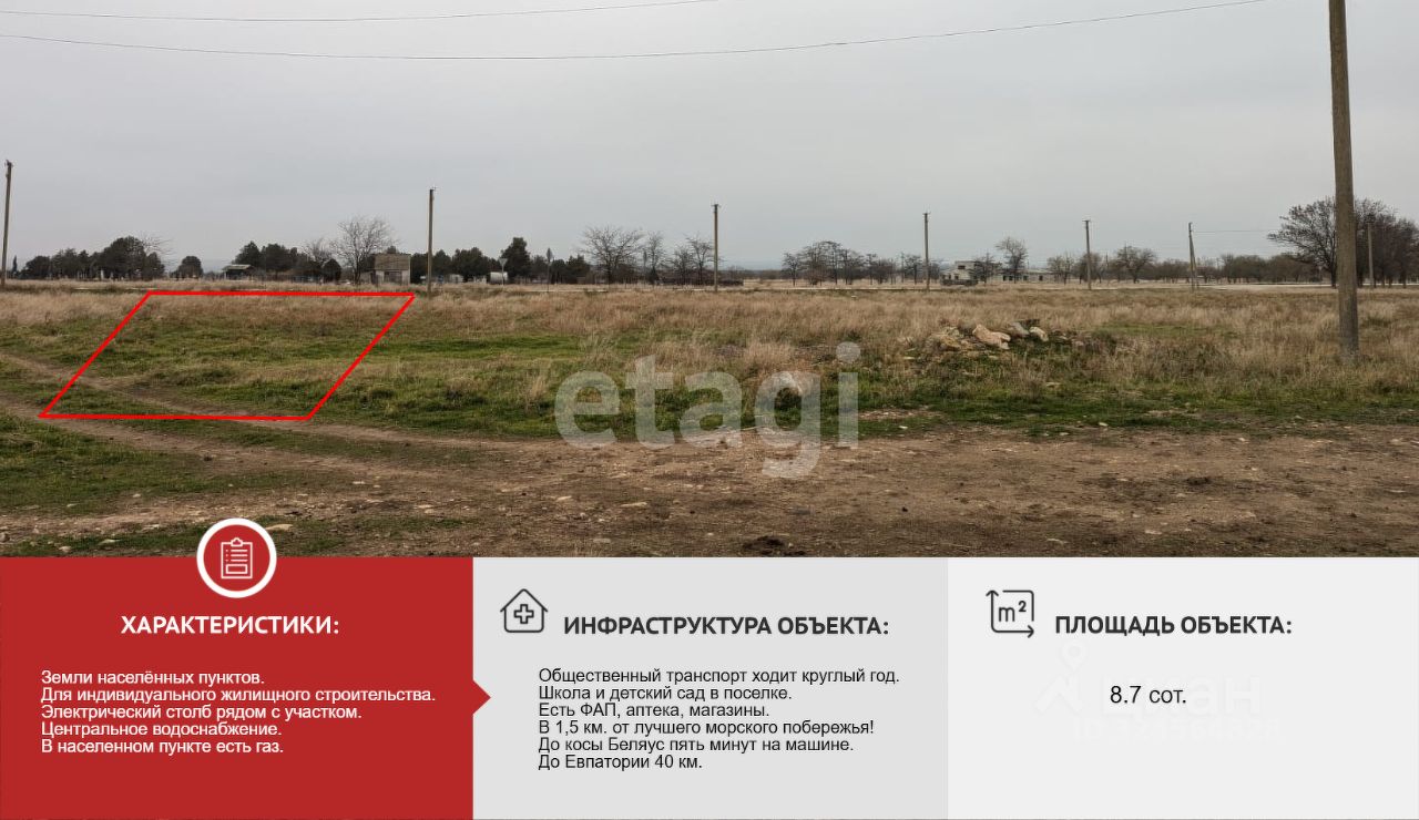 Транспорт ходит круглый год. Школа и детский сад в поселке. Так же есть ФАП, аптека, магазины. В полутора километрах от лучшего морского побережья прекрасных песчаных пляжей и чистейшего моря! До косы Беляус пять минут на машине. Прекрасное место для постройки собственного дома, а также под сдачу. До Евпатории сорок километров.