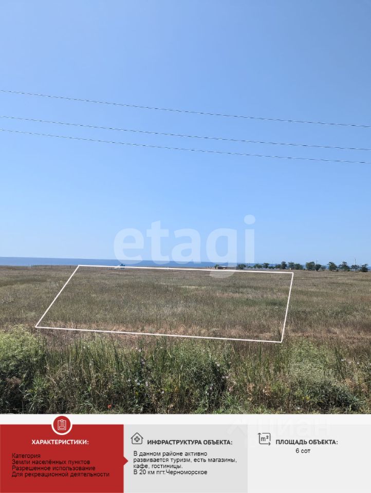 Продается земельный участок площадью 6 соток в одном из самых экологически чистых районах Крыма, на территории Окуневского сельского поселения, Черноморского района! Категория земель: земли населенных пунктов, вид разрешенного использования - рекреация.