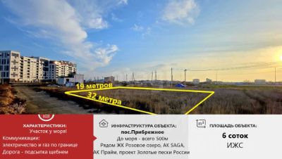 Участок располагается в уникальной локации: между морем и Розовым озером! Рядом построена и сдана в эксплуатацию первая очередь ЖК Розовое озеро. На берегу моря строятся несколько комплексов: Saga, Прайм, скоро начнется грандиозна строительство по федеральному проекту "Золотые пески России", которые привлекут большой поток туристов и повысит качество инфраструктуры.