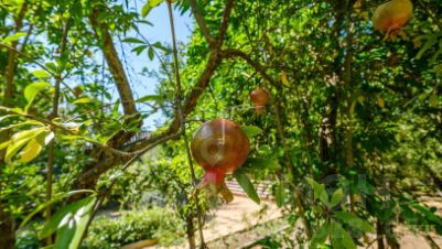 Ровный участок 14 соток утопает в зелени и ароматах спелых фруктов. Здесь растут яблони, персики, гранаты, черешня, виноград — все взрослые, плодоносящие, готовые радовать вас урожаем.