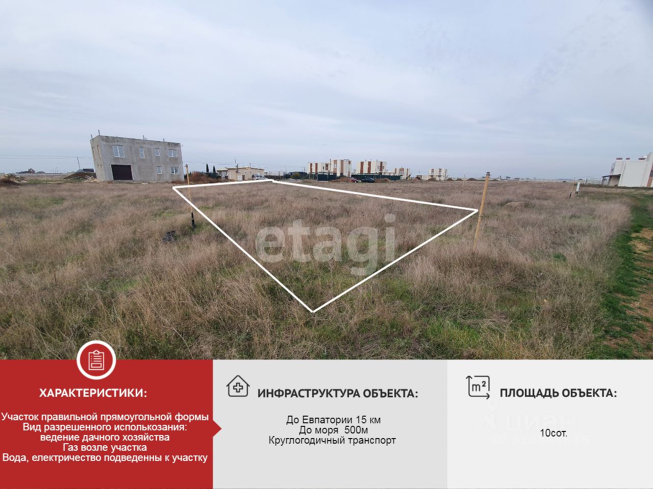 Расположение участка: всего 3 км до села Витино, 4 км до Молочного, и 16 км до центра Евпатории.