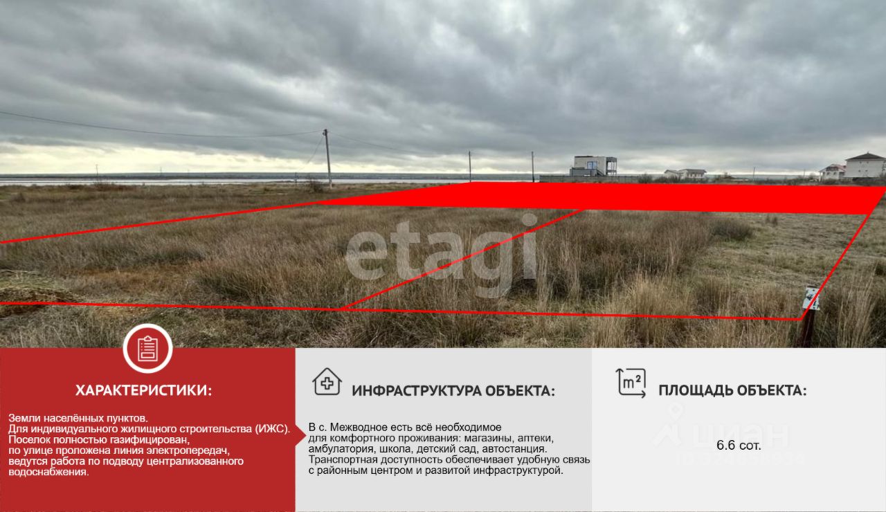 Продается участок площадью 6,6 сотки расположенный в селе Межводное Черноморского района. Земля относится к категории земель населенных пунктов, с разрешенным использованием для индивидуального жилищного строительства (ИЖС).