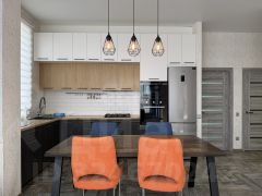 Двухэтажная планировка включает цокольный уровень, что обеспечивает рациональное использование пространства, гараж на два авто . На первом этаже расположены кухня-гостиная, объединённая в единое светлое помещение с витражными окнами от пола до потолка , две спальни , просторный санузел, прихожая с гардеробной и кладовая.
