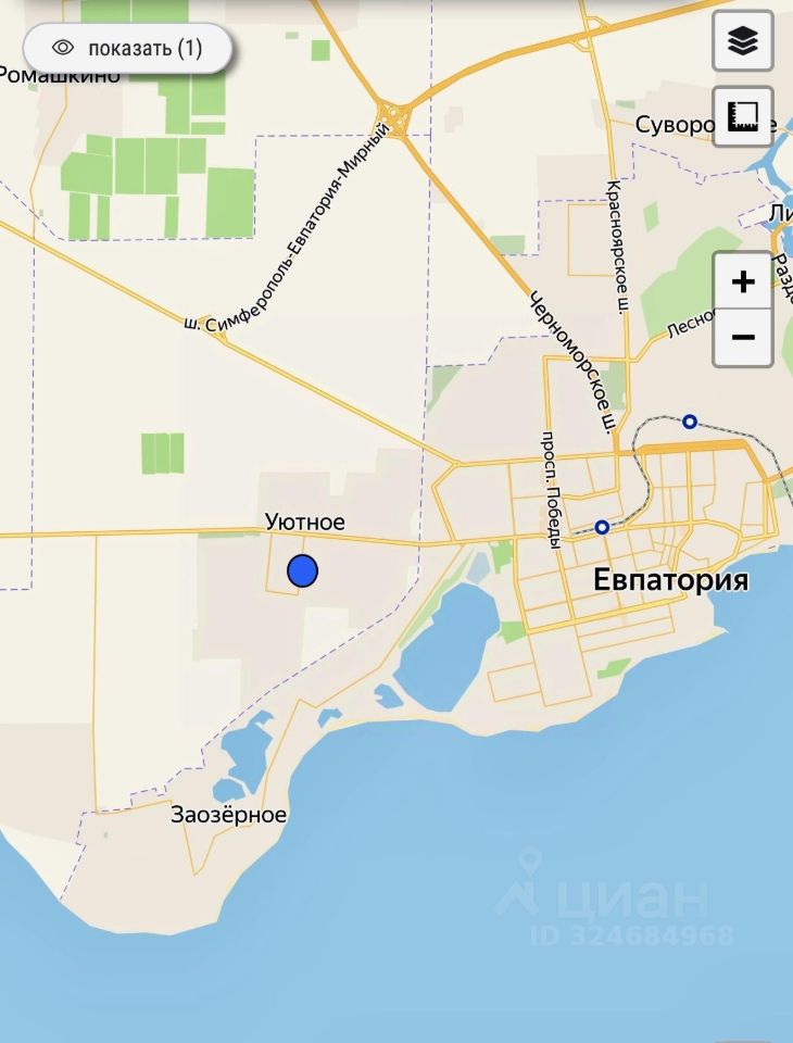 Отличное расположение участка, до города Евпатория 4км. Расстояние до моря 10мин на авто. Тихий спокойный поселок со всей необходимой инфраструктурой: школа, садик, магазины.