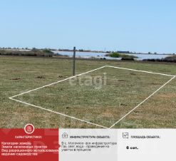 Участок правильной формы, расположен в границах населенного пункта, назначение земли: СНТ. Разрешается строить капитальный дом. Находится всего в 100 метрах от лечебного озера и в 1 км от моря с песчаными пляжами. Район активно застраивается, и в ближайшее время будут подведены все коммуникации: свет, газ и водоснабжение. Уже идет процесс электрификации территории (столбы проходят по улице).