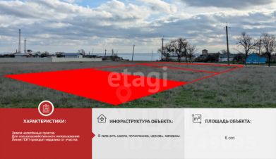 Участок примыкает к дороге с прекрасным видом на море. Линия ЛЭП проходит недалеко от участка. Проведено межевание. Данный земельный массив прекрасно подходит для организации гостиничного или туристического бизнеса, для коттеджной застройки, для инвестирования.