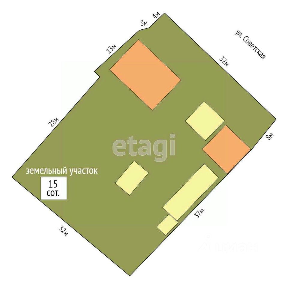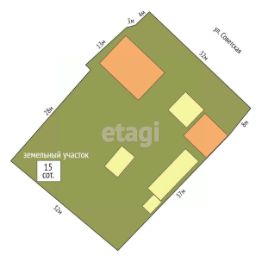 Участок площадью 15 соток имеет ровный рельеф и предназначен для индивидуального жилищного строительства. Территория благоустроена: высажен молодой фруктовый сад, есть три недостроенных номера с кухней под сдачу, летний душ и туалет, здание с двумя комнатами и верандой, гараж, баня и сарай, по периметру возведен забор.