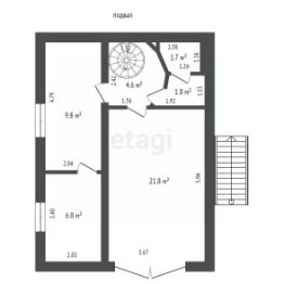 Первый этаж (цокольный) включает в себя две уютные комнаты (6.8 и 9.8 кв.м), гараж (21.8 кв.м), небольшой санузел и удобную винтовую лестницу, ведущую на второй этаж.