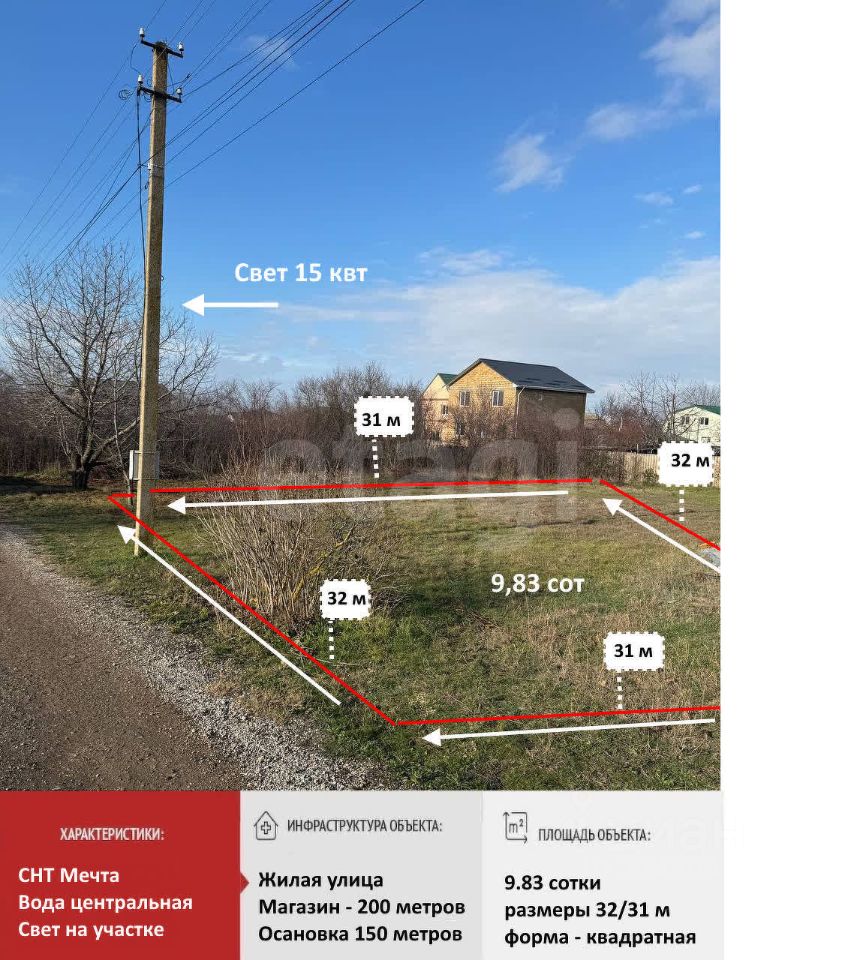 Участок ровный , без уклонов, квадратной формы, хорошая фасадная часть.