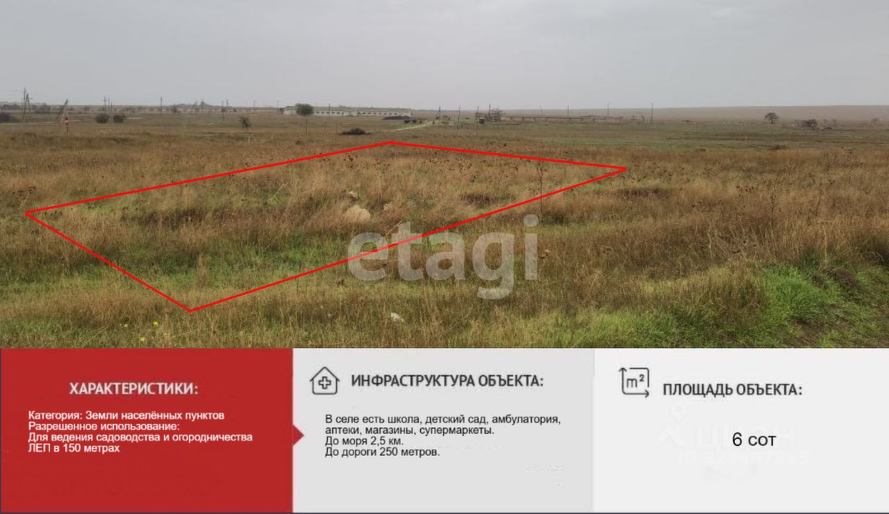 Участок находится на территории села Оленевка. Ровный, правильной прямоугольной формы. На участке проведено межевание. Электроснабжение и газ проходят по границе массива. Водоснабжение и канализация в селе централизованные.