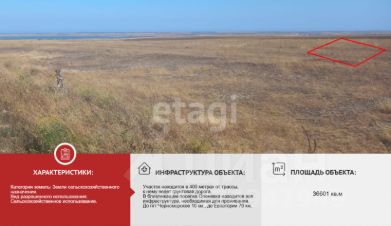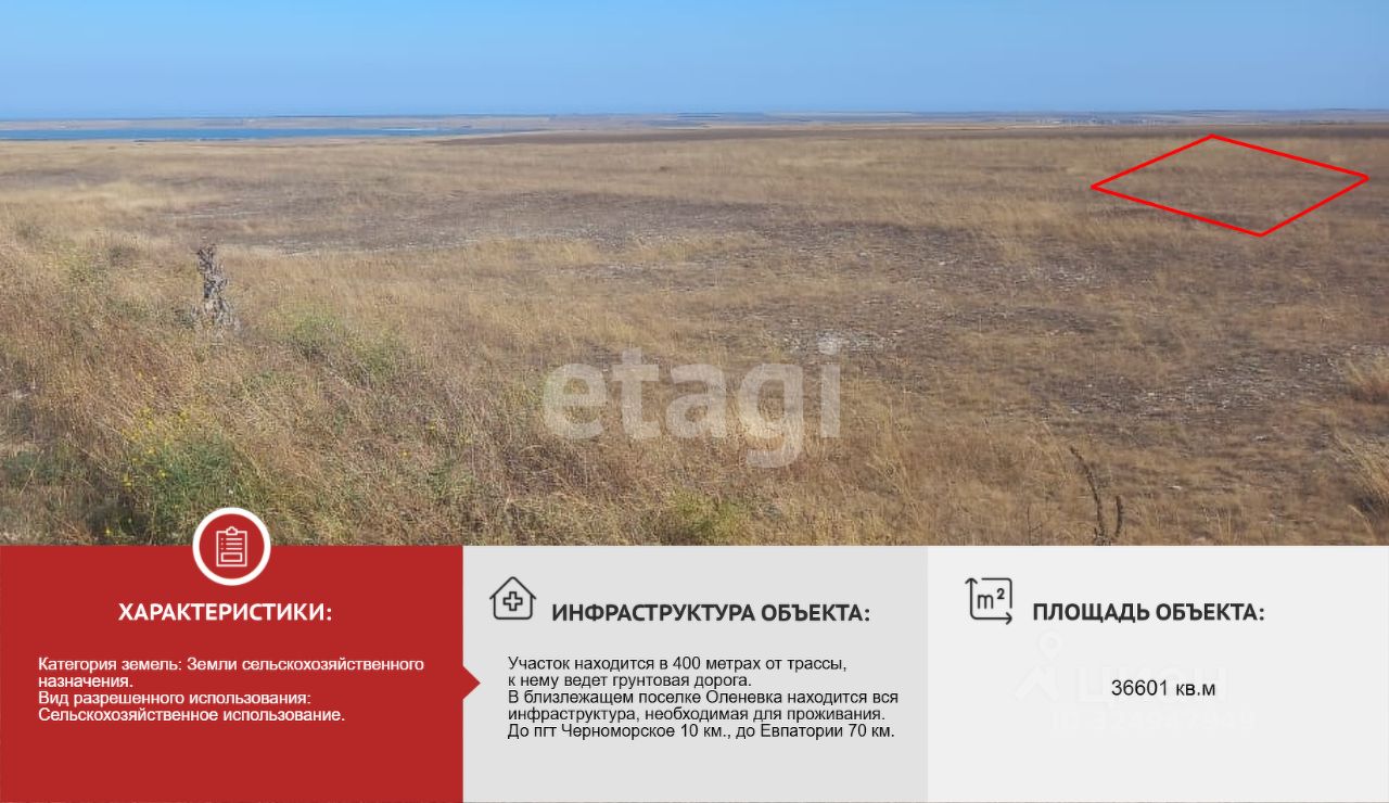 Участок находится в 400 метрах от трассы, к нему ведет грунтовая дорога. С участка открывается великолепный вид на море. В близлежащем поселке Оленевка находится вся инфраструктура, необходимая для проживания.