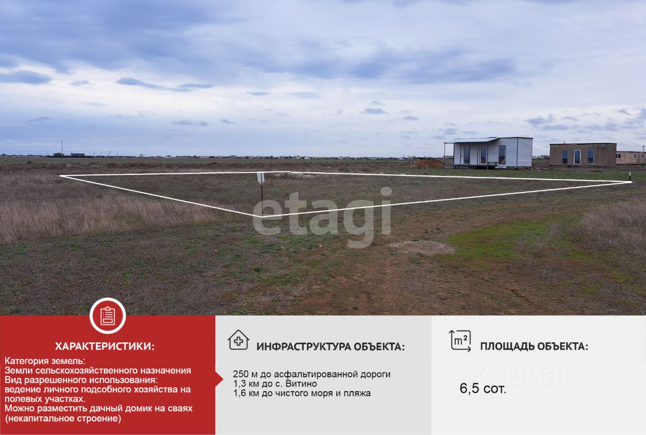 Продается участок 6,52 соток ЛПХ рядом с с. Витино и Евпаторией, ровный, недалеко от моря.