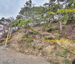 Участок находится на плато небольшого холма, благодаря этому с участка открывается прекрасный вид на море, и Ай-Петринскую яйлу. Такое удачное расположение позволяет разместить уединенный панорамный дом, встроенный в природу, но с хорошей транспортной доступностью.