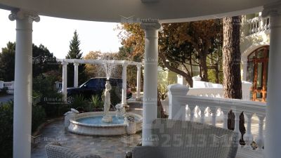 Коттедж окружает ухоженный сад с крымскими соснами, земляничными деревьями, можжевельником. Среди этой зелени расположились романтическая беседка, фонтан, летняя терраса, а так же место под парковку. Есть проект под закрытый бассейн.
