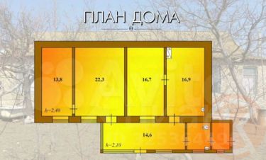 В доме три комнаты (52,8 кв м), просторная кухня (16,9 кв м), санузел, котельная и веранда площадью 16,6 кв м. Высота помещений - 2,40 кв м. Над домом по всей площади расположен чердак. К дому пристроен гараж 15,5 м2 высотой 1,80 м с оборудованной смотровой ямой. Здание требует косметического ремонта.