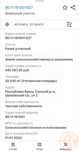 Продается земельный участок сельхоз.назначения. Кадастровый номер 90:11:161001:627. Межевание проведено. 30 045 кв. м.. Сакский район Ореховский с/ с . Коммуникаций нет, но рядом жд ветка прямо на против участка. Документы РФ удобное месторасположение.