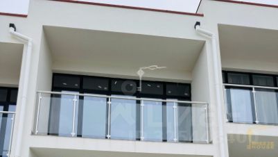 -Балкон с плиткой и стеклянными перегородками;