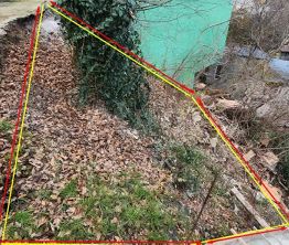 Участок на склоне. Рядом уже построены 3-этажные гаражи с надстройками.