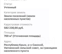 Продается земельный участок ИЖС площадью 7.69 соток по адресу Республика Крым, р-н Сакский, с. Уютное. Участок ровный прямоугольной формы. По границе участка проходит центральный водопровод, ГАЗ. До центра города 1 км. до городского пляжа 2 км. В селе хорошо развита инфраструктура, имеются по близости: Сто, шиномонтаж, строительные магазины, продуктовые магазины, школа, детский сад. Кадастровый номер участка:90:11:220201:1481