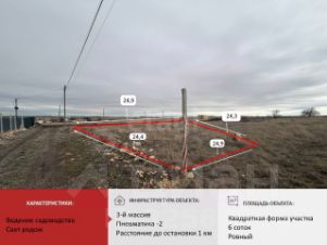 Продается земельный участок площадью 6 соток в СНТ "Пневматика-2" на 3-м массиве под Симферополем. Участок имеет правильную прямоугольную форму с размерами 24 на 25 метров, что упрощает планировку и эффективное использование территории. Рельеф ровный, без склонов и перепадов, что минимизирует затраты на подготовку к строительству или организации сада. Назначение — для ведения садоводства. Ключевым преимуществом является близость к городской инфраструктуре при сохранении спокойной загородной атмосферы. Расстояние до центра Симферополя составляет примерно 11 километров, что обеспечивает быструю доступность на личном транспорте. От асфальтированной дороги до участка — около 1 километра по грунтовому подъезду, также в пешей доступности имеется остановка общественного транспорта. Электроснабжение доступно для подключения — опора расположена напротив участка у соседей. Это практичный и перспективный вариант для тех, кто ищет готовый к освоению участок в развивающемся пригороде с видом на будущее.