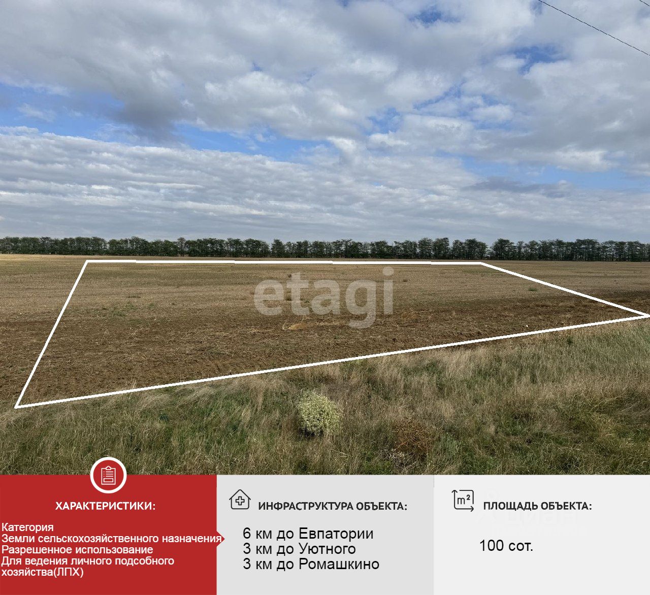Два смежных участка земли для ведения личного подсобного хозяйства общей площадью 1 гектар. Расположены всего в 3 км от с. Уютное и 6 км от Евпатории. В непосредственной близости (1 км) проходит федеральная трасса "Таврида", что обеспечивает отличную транспортную доступность и открывает широкие перспективы для использования.