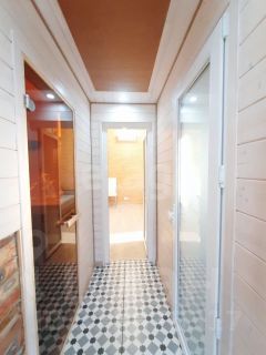 В комнате ламинат, в коридоре, санузле, сауне полы керамическая плитка .