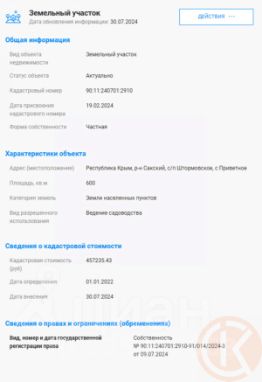 Продается участок 6 соток Садоводство, земли населенных пунктов. В Сакском районе,с/п Штормовое, село Приветное. Свет от данного участка не больше 100 метров вдоль трассы, как и сама трасса рядом. До моря 5 км. Провели грейдирование дорог и ведут коммуникации. Границы вынес, участок ровный.