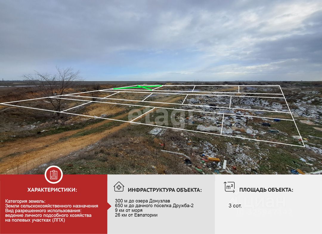 Участок площадью 3 сотки расположен в Штормовском сельском поселении, всего в 300 метрах от целебных вод озера Донузлав, знаменитого своими грязями. В непосредственной близости дачный поселок Дружба-2. До моря 9 км. До с. Поповка — 7 км, до пгт. Новоозерное — 3 км. До Евпатории 29 км. Идеальное место для отдыха и оздоровления на природе.