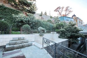 Участок — закрытый, 2,5 м забор, вековые ели, пальмы, розы, лавр, глициния. Два бассейна — один с водопадом, второй — для купания, облицован мрамором.