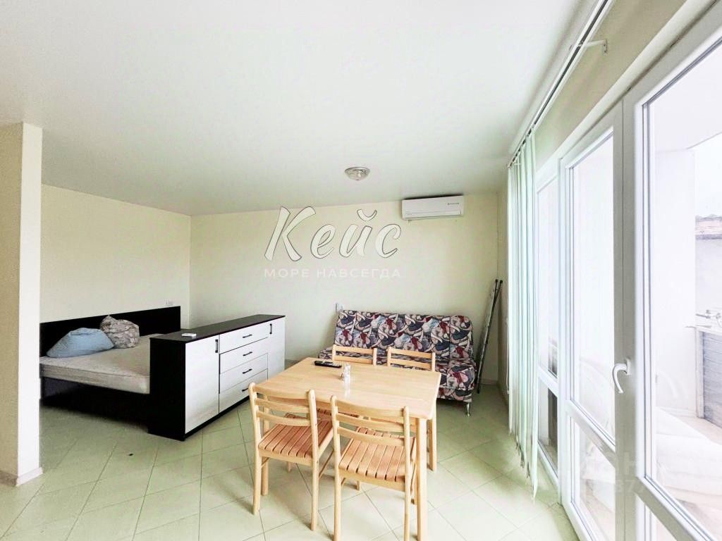 Планировка второй этаж: гостиная-студия, совмещенный санузел, балкон с видом на море.