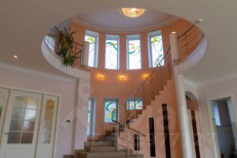 Впечатляющий холл-гостиная с вторым светом (82,1 м²) и изящной лестницей с витражными окнами.