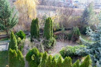 Ухоженный сад с хвойными (голубые ели, кипарисы, туи, можжевельник) и плодовыми деревьями.