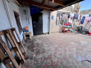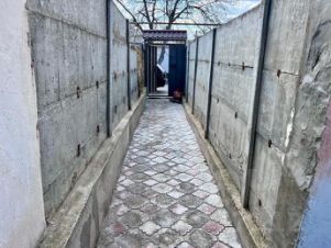 Участок огражден забором из камня. Во дворе тротуарная плитка.
