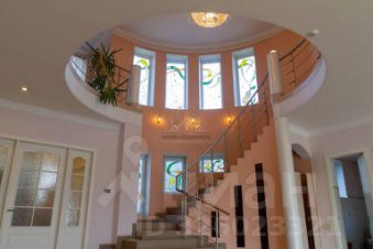 Впечатляющий холл-гостиная с вторым светом (82,1 м²) и изящной лестницей с витражными окнами.
