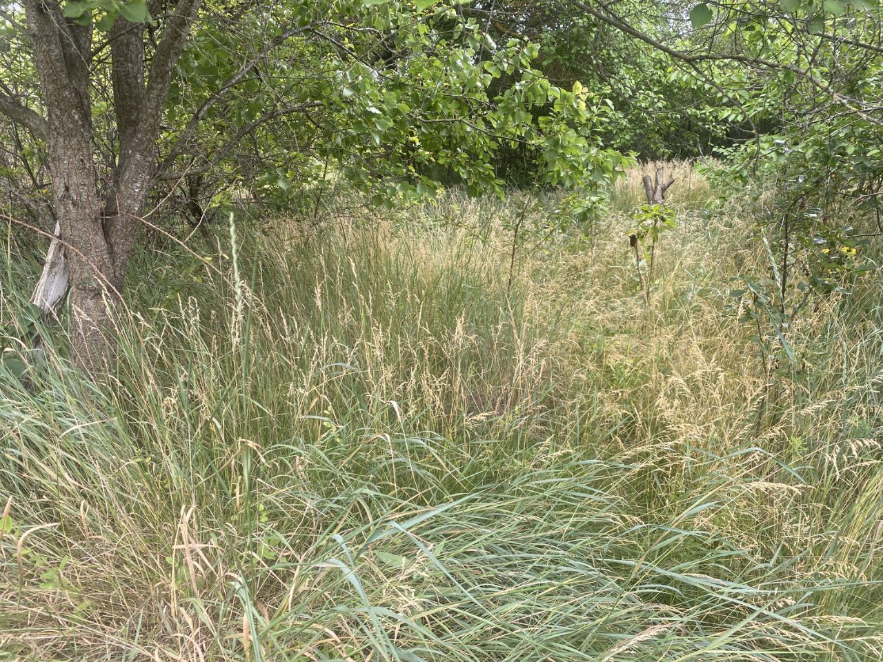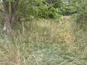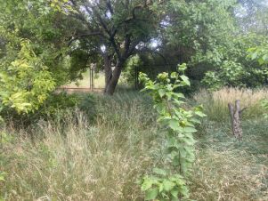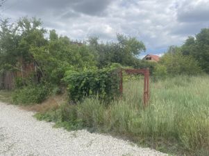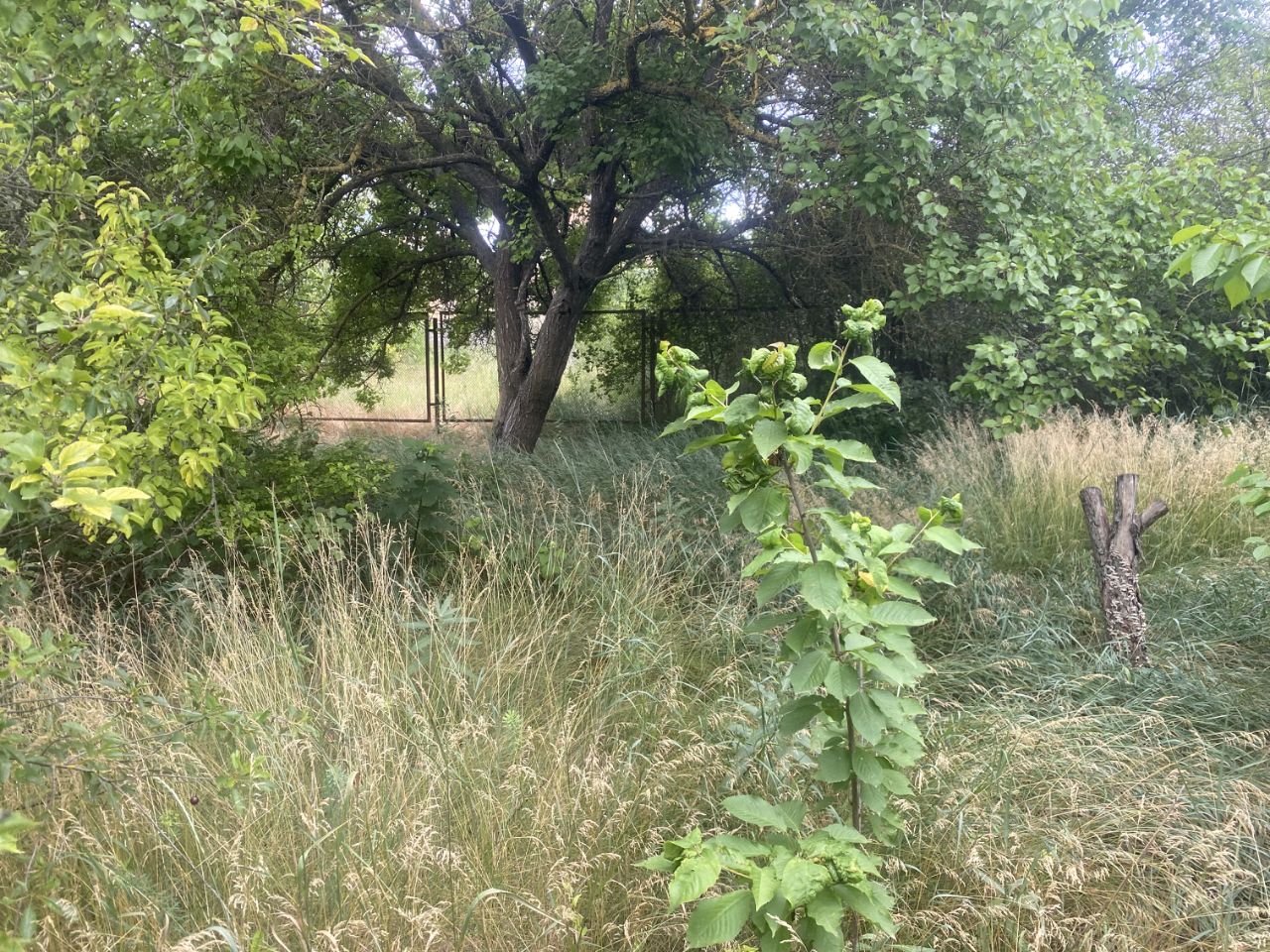 Участок огражден с трех сторон. На дальней половине фруктовые деревья. Ближняя для строительства. Есть фундамент для домика 5 на 6 метров.