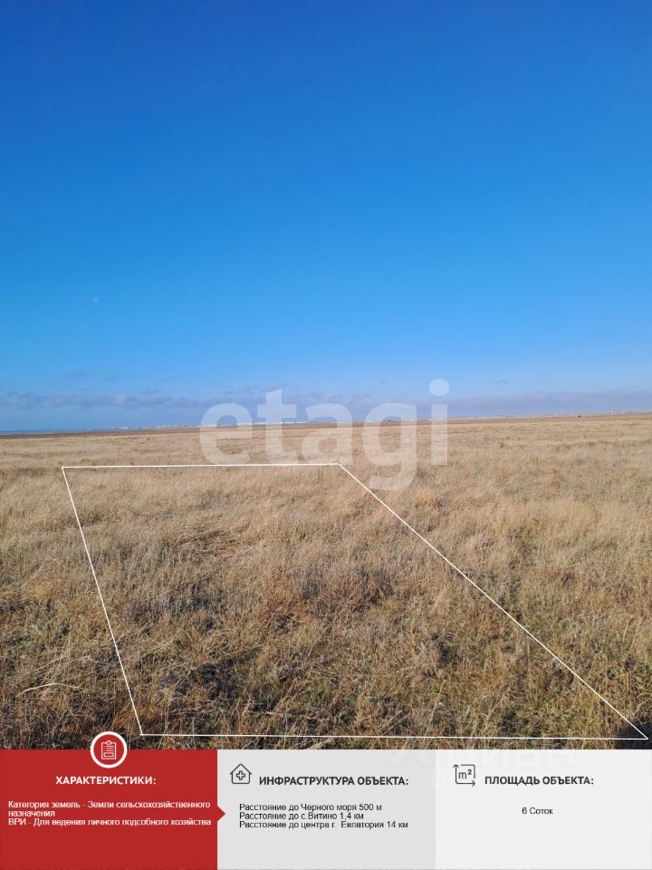 Участок ровный прямоугольной формы, не огорожен. Электричество проходит вдоль участка. Расположен в 1,4 км от с. Витино Сакского района, в котором есть вся необходимая инфраструктура: аптеки, ФАП, магазины и рынок.