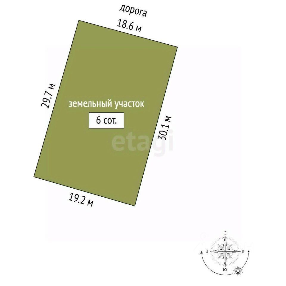 Площадь участка 6 соток, ИЖС, межевание сделано. Участок ровный, правильной прямоугольной формы.