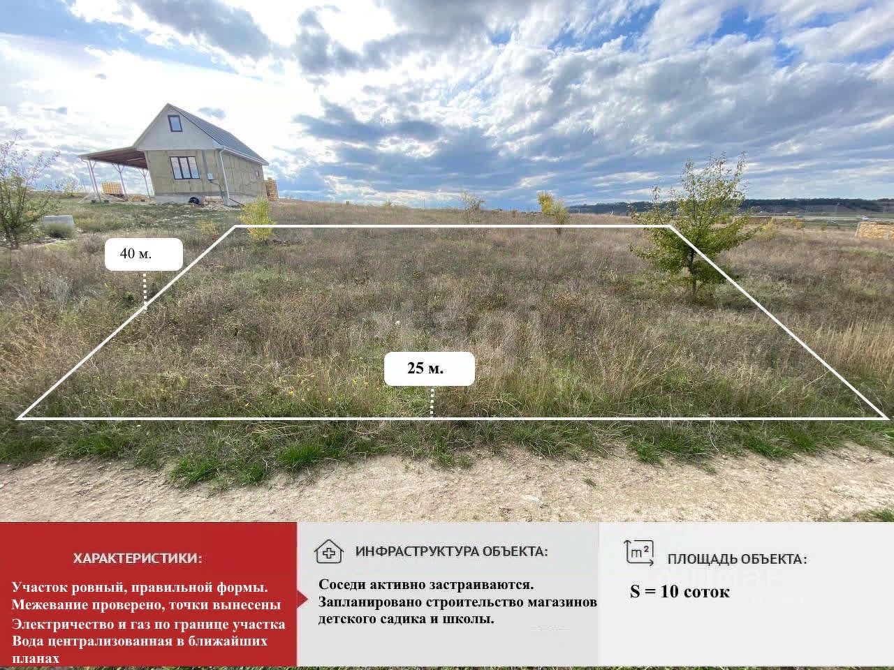Участок, площадью 10 соток, расположен в селе Левадки и предлагает уникальную возможность для строительства частного дома в живописной местности с панорамным видом на долину.