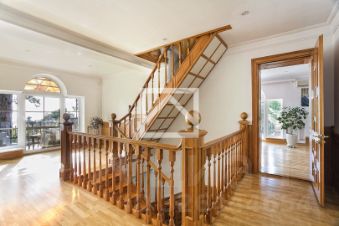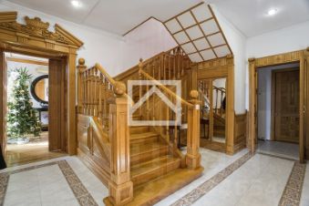 В оформлении резиденции — сдержанная роскошь натуральных материалов. Мраморная прохлада, дубовый паркет, окутывающее тепло бука в спальнях. Монументальная лестница из массива дерева соединяет этажи. Классические светильники мягко акцентируют детали интерьера.