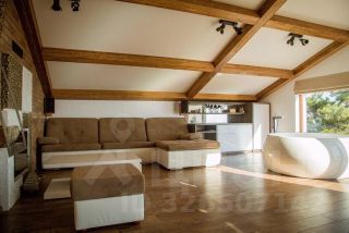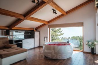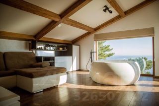 Третий этаж: просторная спальня с круглой ванной, камином и выходом на террасу с панорамным видом на море, горы и сосны; санузел с туалетом и душем.