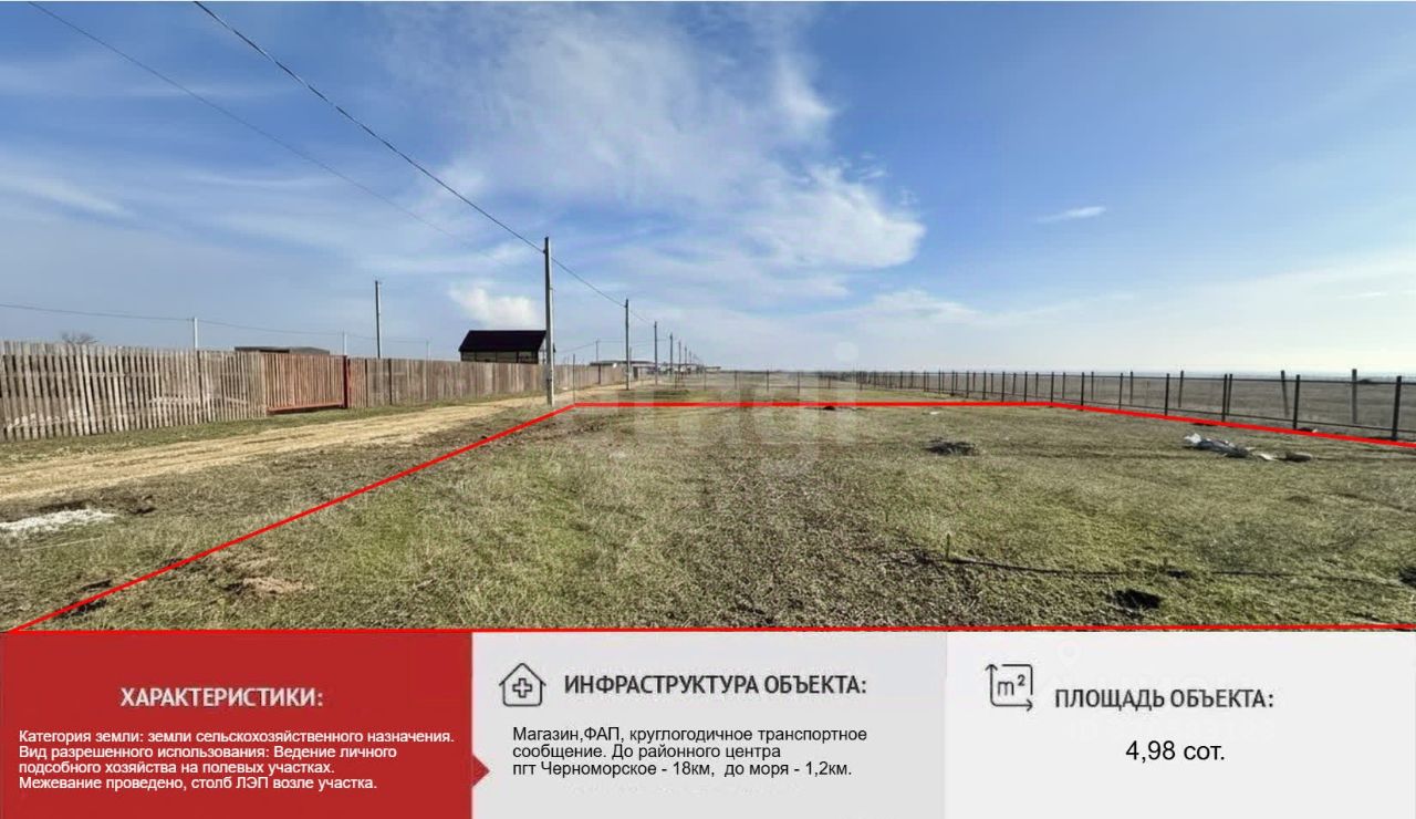 В границе села есть вся необходимая инфраструктура: магазины, ФАП находятся в пешей доступности. Транспортное сообщение круглогодичное. Районный центр, поселок Черноморское, находится всего в 18 км, что обеспечивает доступ к более широкому спектру услуг и административным учреждениям. Хорошая перспектива для развития туристического бизнеса или сезонной аренды, благодаря близости к популярным пляжам с чистой морской водой.
