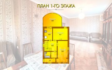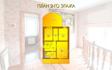 Дом представляет собой двухэтажное строение с цоколем общей площадью 232,5 м2. На первом этаже расположены просторная веранда площадью 20,5 м2, гостиная, спальная комната, кухня площадью 10,2 м2 и санузел с душевой кабиной. На втором этаже три спальных комнаты, санузел с ванной и терраса. В цокольной части здания свободные помещения, которые можно использовать в разных целях, и гараж площадью 24,8 м2.