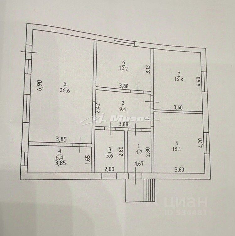 Дом состоит из: прихожая (4.7 кв.м.), холл (9.4 кв.м.), кухня-гостиная (26.6 кв.м.), санузел (5.6 кв.м), три спальни (15.8+15.1+12.2 кв.м), кладовая (6.4 кв.м.).